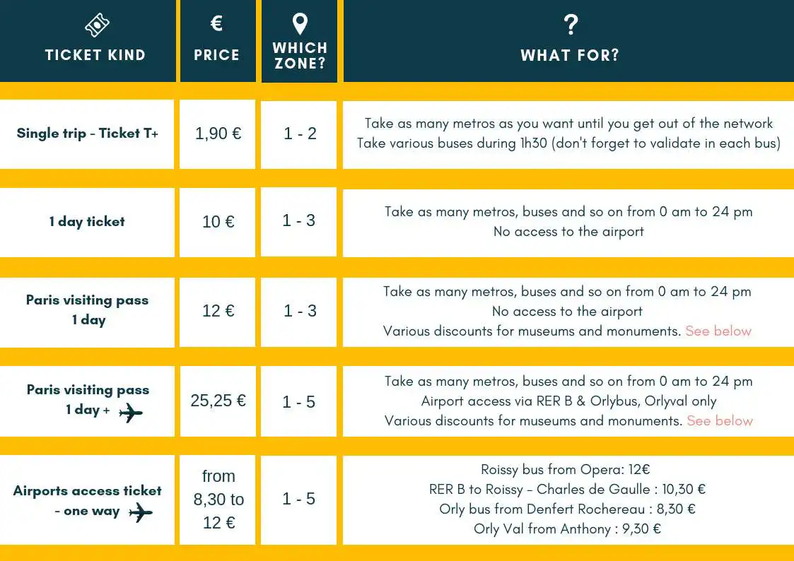 Well, if you go on the RATP website, you’ll see that you have tourist pass tickets for 1,2 or 3 days. But actually, you can also take simple trip tickets. Let me condense everything below :
