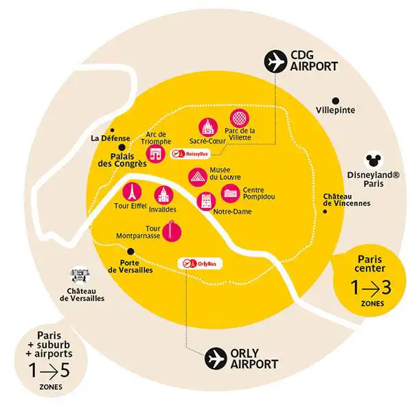 - Zone 4 and 5 are further away suburbs, including Versailles, Disney and the airports.